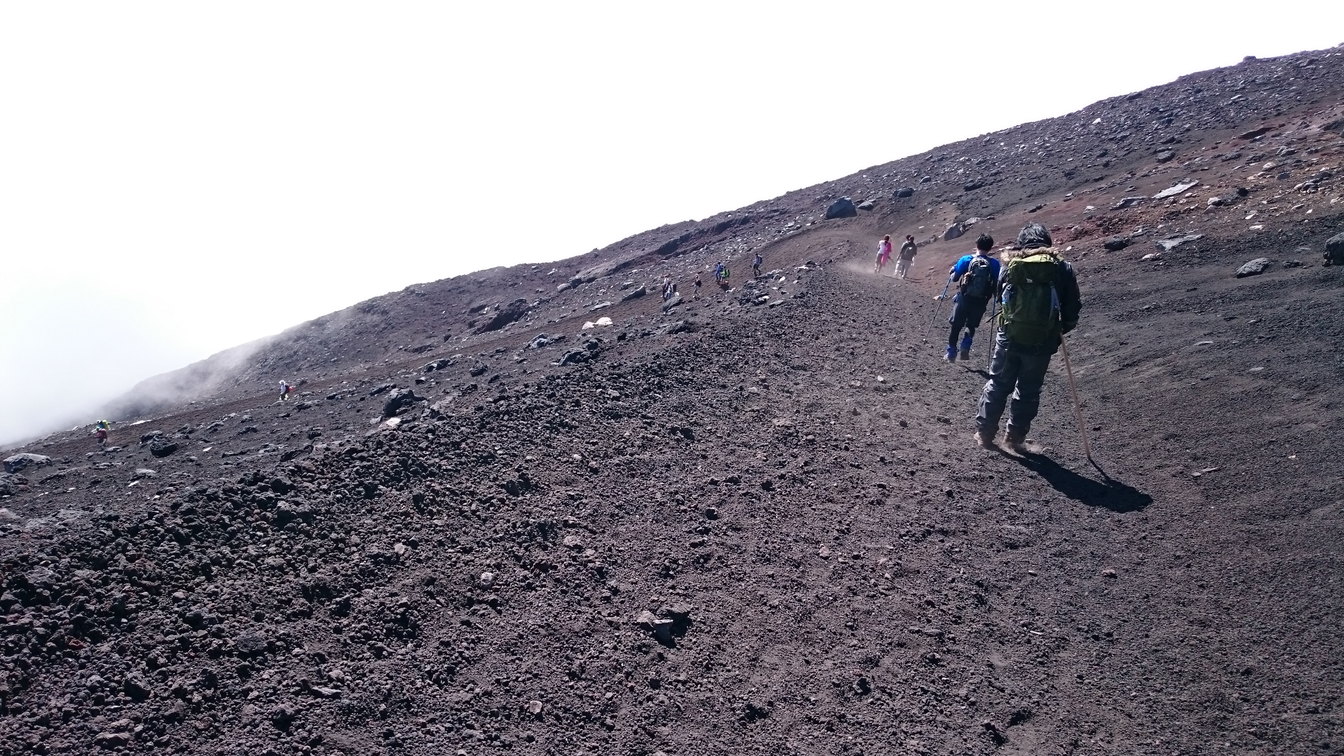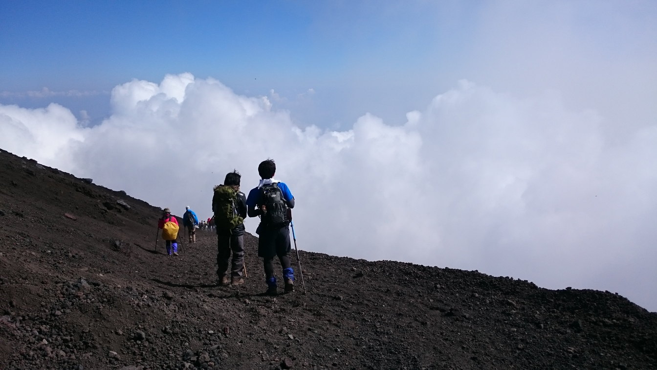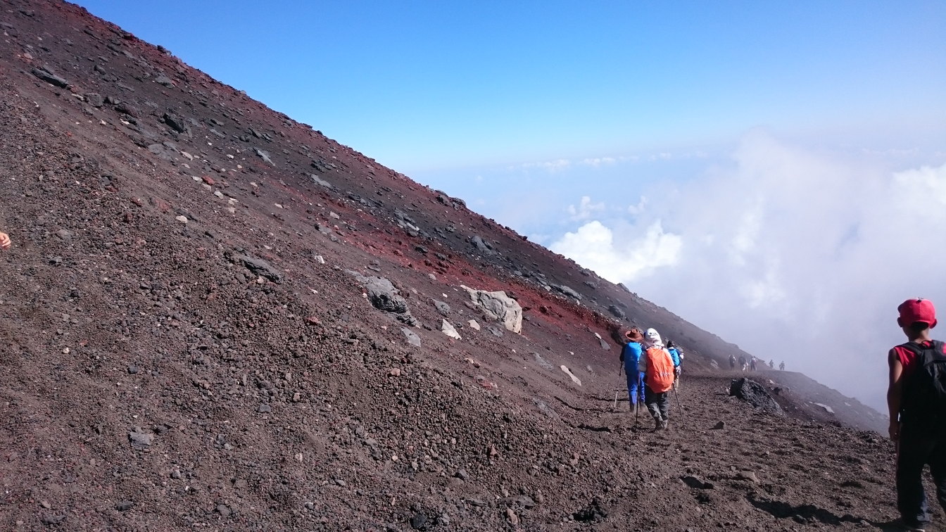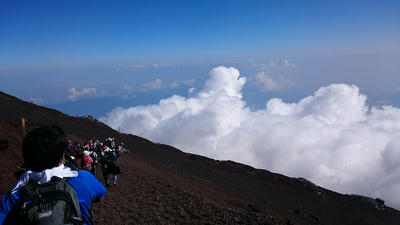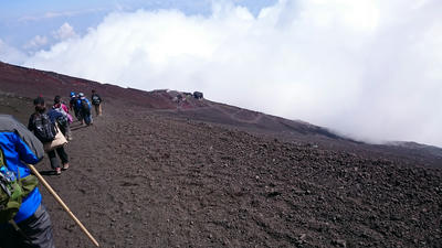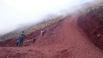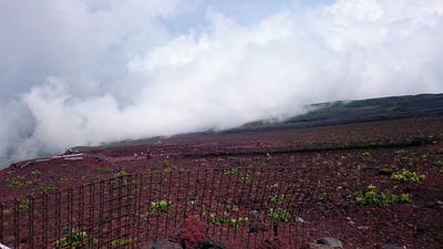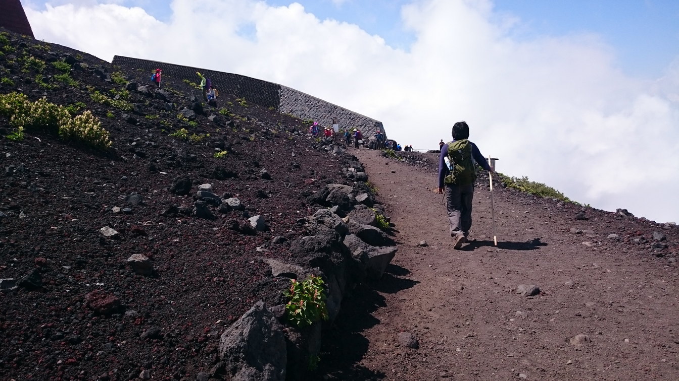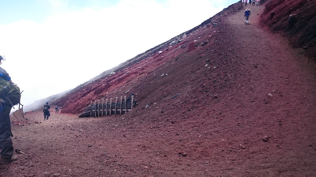 富士登山 part5 登山 2015年08月30日 登録タグ:<登山> <ヤマノススメ> <富士山> 前回のつづき お鉢巡りも終え、後は下山あるのみ。 吉田ルートは雲に覆われています。 高山病で休んでいたHさんと合流に、山小屋を出発です。 下りはブルドーザー用の砂利道をひたすら下る事になります。 先ほどの頂上です。サヨナラです。 雲が時々襲ってきます。コレが涼しくて気持ち良い。 っというのも、頂上は確かに気温は低いですが、 直射日光は超きついんで、日差しを遮ってくれる雲はありがたい。 帽子は必須でしたね。 大きな岩がゴロリ。 こんなのに当たったら一瞬でお陀仏ですね。 昨日宿泊した御来光館と、富士山ホテルが見えてきました。 特に8合目の富士山ホテルは下山道のルート上でもあるので、 そこで一度、大きな休憩を入れる事にします。 かなり砂埃も舞うので、マスクやタオルで口を塞ぐことをオススメします。 ブルドーザーが登ってきました。 山小屋に物資を届けるためですね。コレは頂上行ですね。 砂埃がひどい…ゴホゴホッ! やっと8合目の山小屋です。 きつい直射日光と、変わらない景色と、砂堀で疲労たっぷり。 長い休憩を取って出発です。 ただ、目安の時間を倍ほどかけてますので、ペースが気になるところ。 高度を下げれば高山病が和らぐと思うのですが、今のところは変わらずです。 少しすると次の山小屋が。ココが下山道最後の山小屋となります。 この辺りで須走ルートと分岐するので、気を付けましょう。 またブルドーザーが来ました。今日は頻繁に見ます。 ルートの分岐点です。吉田ルートは黄色。須走ルートは赤です。 よって右へ向かいます。 かなり降りてきたように思えますが、まだ半分も進んでいません…。 つづら折りの道がひたすら続く。 休憩の回数が増えます。Hさんの為を思って取ってたのですが、 徐々に自分の余裕も無くなってきました。 傾斜のきつい所はジグザグに降ります。 何やら施設が見えます。避難所ですかね。 ココでようやく半分くらいでしょうか…。 この頃から足の裏に痛みを感じ始めます。 長時間立っている事悲鳴を上げ始めました。ヤバイ…。 しかも、このペースでは後、2時間以上はかかると思われ。 イヤな予感しかしなくなります。 相変わらずの道が続きます。 緑が見えてきました。高度が低くなってきた証拠です。 そして、7合目のトイレがあったのですが、 写真を撮り忘れていました。 ココでついに自分の足が逝ってしまったので、 仲間を先へ行かせます。 体力自体は残ってるので、すぐに追いつけるはず。 出来るだけ立ってる時間を少なくさせたい。 やっとつづら折りの最終地点です。 この辺りで仲間と合流。 ですが、6合目まではまだ距離が…。もどかしい。 6合目が見えてますが、まだまだ遠い。ひぇぇ…。 ホントはこの中を通りらなければいけないのですが…。 ボロボロの体でこの階段は死んじゃうので、外を歩いてしまいました。 皆さんはちゃんと中を通って下さいね。 久々の森の中の道です。 6合目の近くまできました。 吉田ルートの登りルートです。すごい人。 登りルートとの合流地点。 6合目まで戻ってきました。 ここからは登りと下りで同じ道を通ります。 ここまでくれば、あと少しです。 結局今日も富士五湖を拝めず…。残念でした。 あの上から降りてきました。頑張りました。 そして、5合目到着! 皆さんお疲れさまでした! Hさんの体調もいつのまにか回復してました。高山病って不思議です。 富士山は山小屋もたくさんあり、人も多く、安心して登山はできますが、 長い登山になる事を覚悟して登らなければなりません。 その代わり、頂上では、晴れていれば絶景を見る事が出来ます。 頑張ってみる価値はあると思いますので、 しっかりと準備してから登りましょう。 今回は友人Iさんのカメラで撮ったものも多数掲載させて頂きました。 ありがとうございました。 これで富士登山の記事は終了です。 ご愛読ありがとうございました! [2回]PR