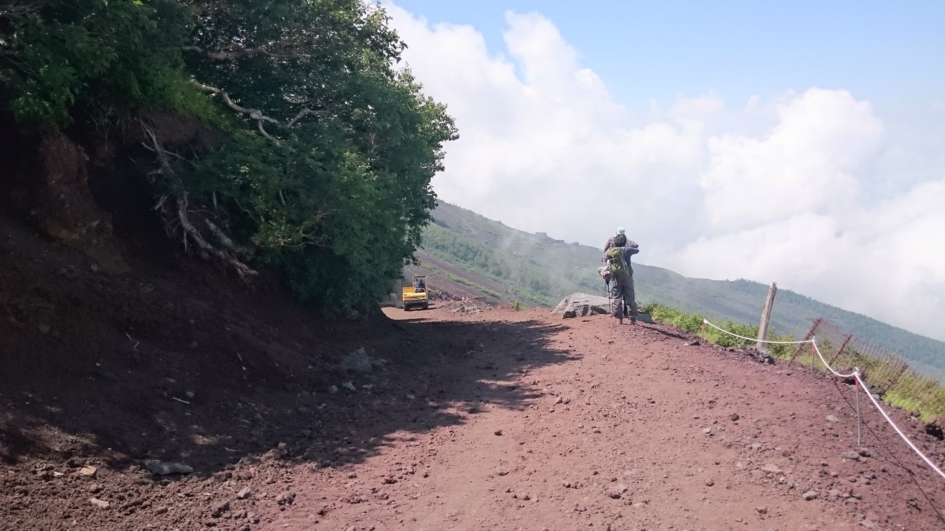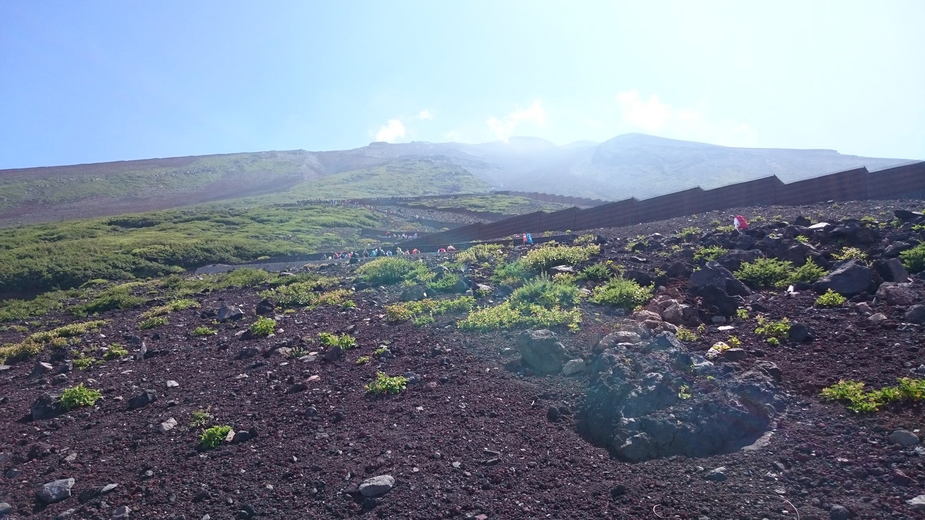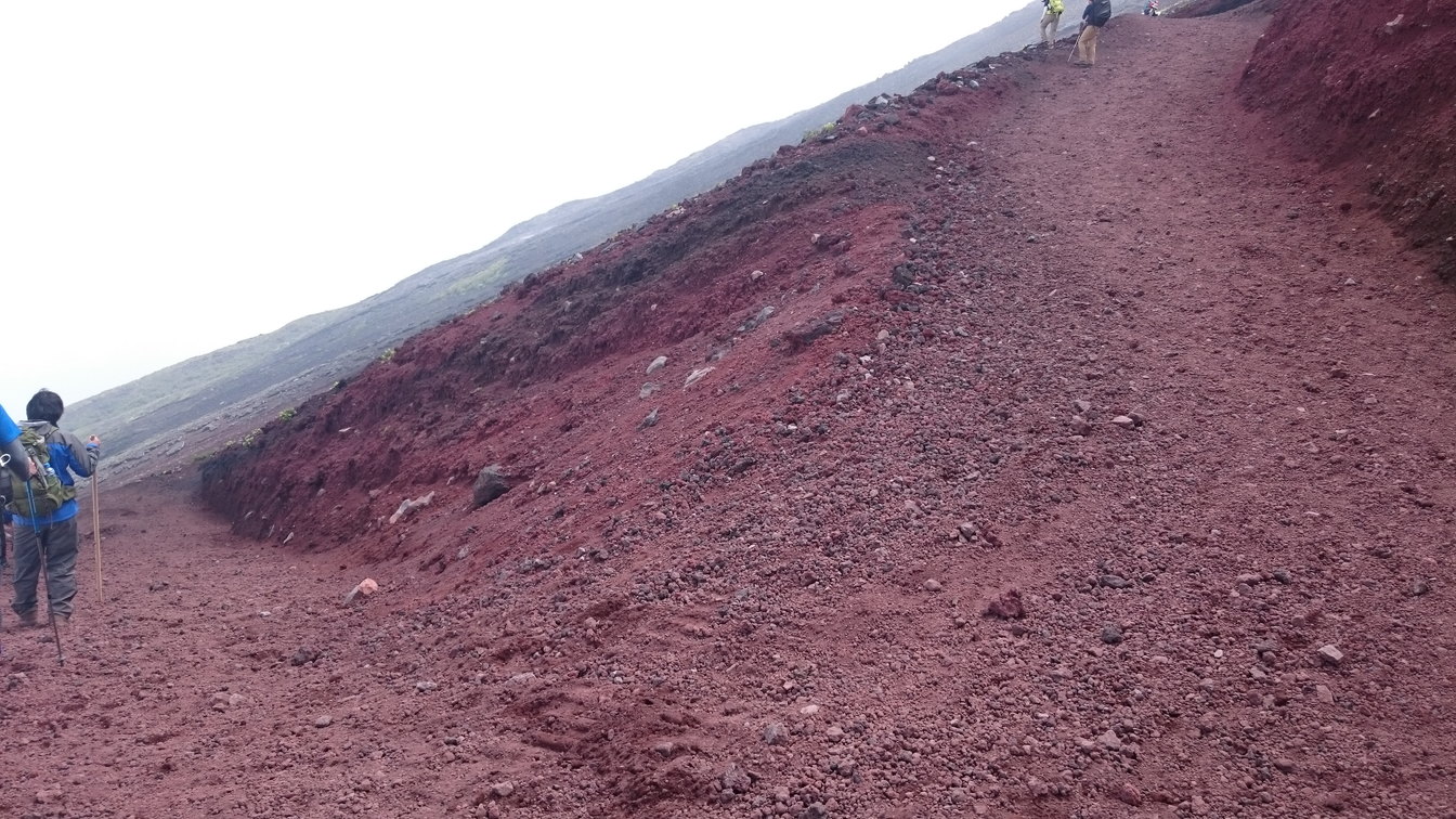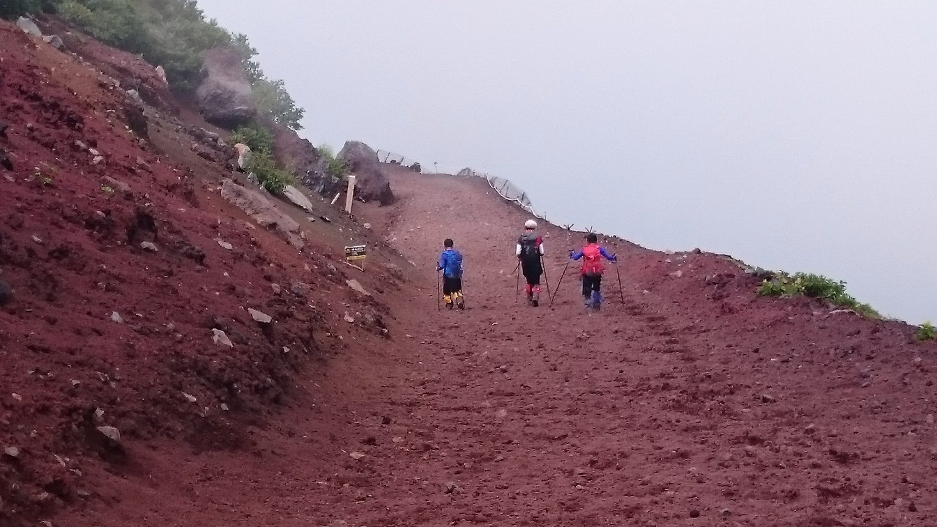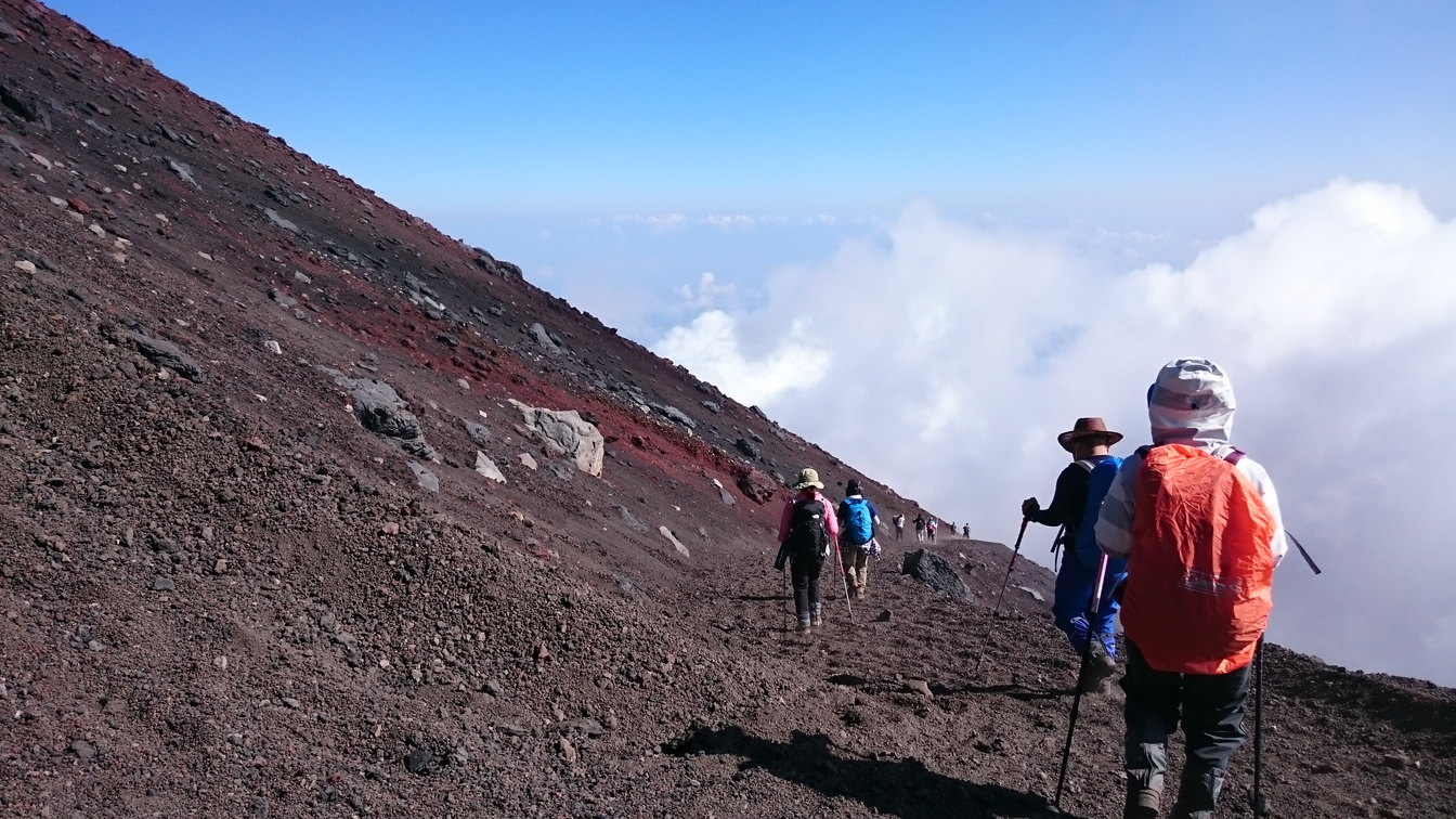 富士登山 part5 登山 2015年08月30日 登録タグ:<登山> <ヤマノススメ> <富士山> 前回のつづき お鉢巡りも終え、後は下山あるのみ。 吉田ルートは雲に覆われています。 高山病で休んでいたHさんと合流に、山小屋を出発です。 下りはブルドーザー用の砂利道をひたすら下る事になります。 先ほどの頂上です。サヨナラです。 雲が時々襲ってきます。コレが涼しくて気持ち良い。 っというのも、頂上は確かに気温は低いですが、 直射日光は超きついんで、日差しを遮ってくれる雲はありがたい。 帽子は必須でしたね。 大きな岩がゴロリ。 こんなのに当たったら一瞬でお陀仏ですね。 昨日宿泊した御来光館と、富士山ホテルが見えてきました。 特に8合目の富士山ホテルは下山道のルート上でもあるので、 そこで一度、大きな休憩を入れる事にします。 かなり砂埃も舞うので、マスクやタオルで口を塞ぐことをオススメします。 ブルドーザーが登ってきました。 山小屋に物資を届けるためですね。コレは頂上行ですね。 砂埃がひどい…ゴホゴホッ! やっと8合目の山小屋です。 きつい直射日光と、変わらない景色と、砂堀で疲労たっぷり。 長い休憩を取って出発です。 ただ、目安の時間を倍ほどかけてますので、ペースが気になるところ。 高度を下げれば高山病が和らぐと思うのですが、今のところは変わらずです。 少しすると次の山小屋が。ココが下山道最後の山小屋となります。 この辺りで須走ルートと分岐するので、気を付けましょう。 またブルドーザーが来ました。今日は頻繁に見ます。 ルートの分岐点です。吉田ルートは黄色。須走ルートは赤です。 よって右へ向かいます。 かなり降りてきたように思えますが、まだ半分も進んでいません…。 つづら折りの道がひたすら続く。 休憩の回数が増えます。Hさんの為を思って取ってたのですが、 徐々に自分の余裕も無くなってきました。 傾斜のきつい所はジグザグに降ります。 何やら施設が見えます。避難所ですかね。 ココでようやく半分くらいでしょうか…。 この頃から足の裏に痛みを感じ始めます。 長時間立っている事悲鳴を上げ始めました。ヤバイ…。 しかも、このペースでは後、2時間以上はかかると思われ。 イヤな予感しかしなくなります。 相変わらずの道が続きます。 緑が見えてきました。高度が低くなってきた証拠です。 そして、7合目のトイレがあったのですが、 写真を撮り忘れていました。 ココでついに自分の足が逝ってしまったので、 仲間を先へ行かせます。 体力自体は残ってるので、すぐに追いつけるはず。 出来るだけ立ってる時間を少なくさせたい。 やっとつづら折りの最終地点です。 この辺りで仲間と合流。 ですが、6合目まではまだ距離が…。もどかしい。 6合目が見えてますが、まだまだ遠い。ひぇぇ…。 ホントはこの中を通りらなければいけないのですが…。 ボロボロの体でこの階段は死んじゃうので、外を歩いてしまいました。 皆さんはちゃんと中を通って下さいね。 久々の森の中の道です。 6合目の近くまできました。 吉田ルートの登りルートです。すごい人。 登りルートとの合流地点。 6合目まで戻ってきました。 ここからは登りと下りで同じ道を通ります。 ここまでくれば、あと少しです。 結局今日も富士五湖を拝めず…。残念でした。 あの上から降りてきました。頑張りました。 そして、5合目到着! 皆さんお疲れさまでした! Hさんの体調もいつのまにか回復してました。高山病って不思議です。 富士山は山小屋もたくさんあり、人も多く、安心して登山はできますが、 長い登山になる事を覚悟して登らなければなりません。 その代わり、頂上では、晴れていれば絶景を見る事が出来ます。 頑張ってみる価値はあると思いますので、 しっかりと準備してから登りましょう。 今回は友人Iさんのカメラで撮ったものも多数掲載させて頂きました。 ありがとうございました。 これで富士登山の記事は終了です。 ご愛読ありがとうございました! [2回]PR